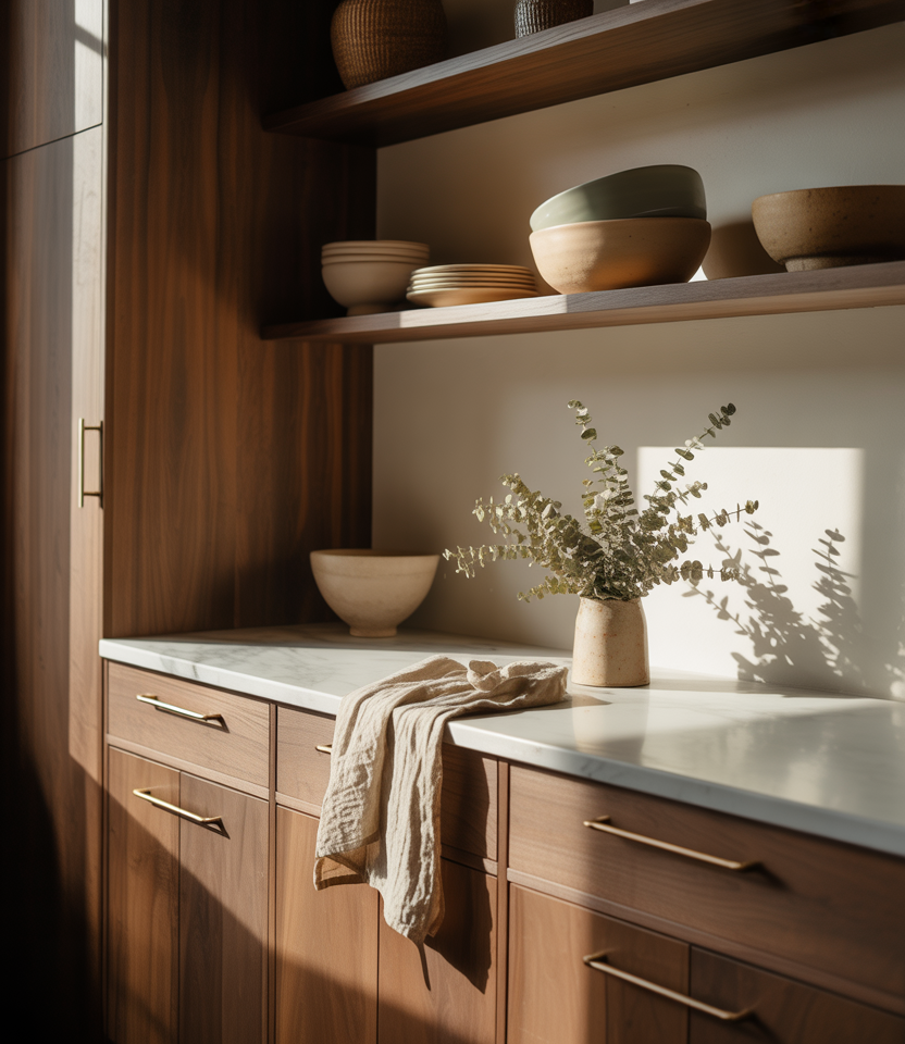 Earthy woods and artisanal touches can soften the decor of modern kitchens. The charm of small accents, like wooden kitchenware or textured ceramics, complements the style nicely. A combination of light autumn rustic accents or some neutral layered textiles can add warmth without overpowering the design.