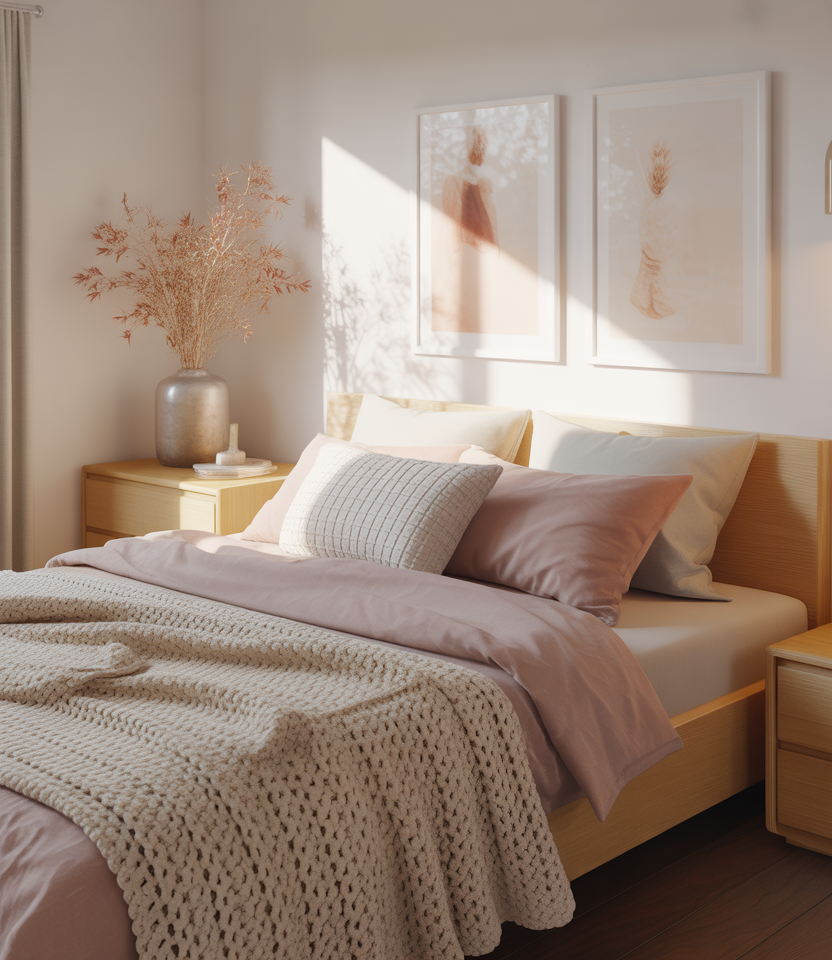 Bedrooms become cozier when they include more crafted soft furnishings. The addition of crocheted blankets and pillows along with wall hangings provides more texture and a warm aesthetic. The overall effect can be layered with more subtle color palettes or hints of pastel shades from the wedding season to give a calm and inviting atmosphere.