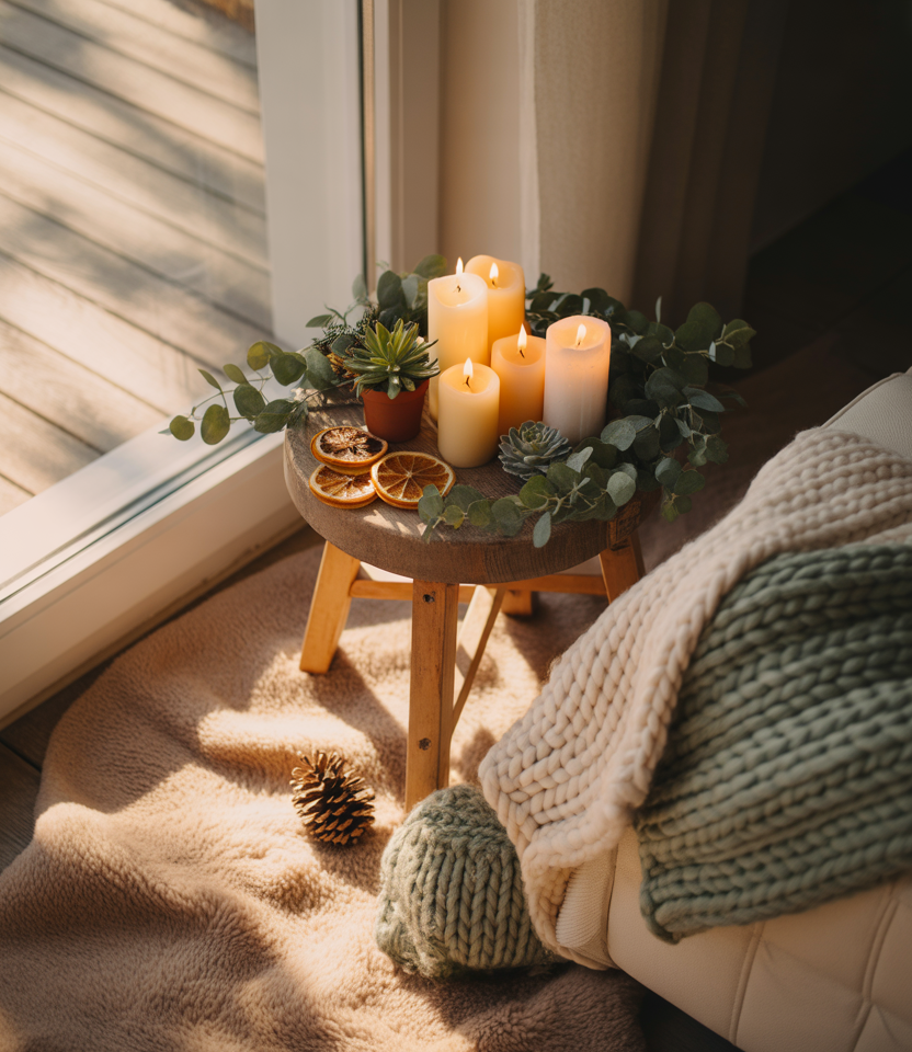 A corner that is designed seasonally is a simple way to add coziness to the space without taking over the whole area. A handful of candles, some cozy blankets, or small foam greenery are capable of making the corner feel festive. Adding various layers of Christmas and gentle cozy materials or soft shades of fall creates a mood that can change without much fuss.