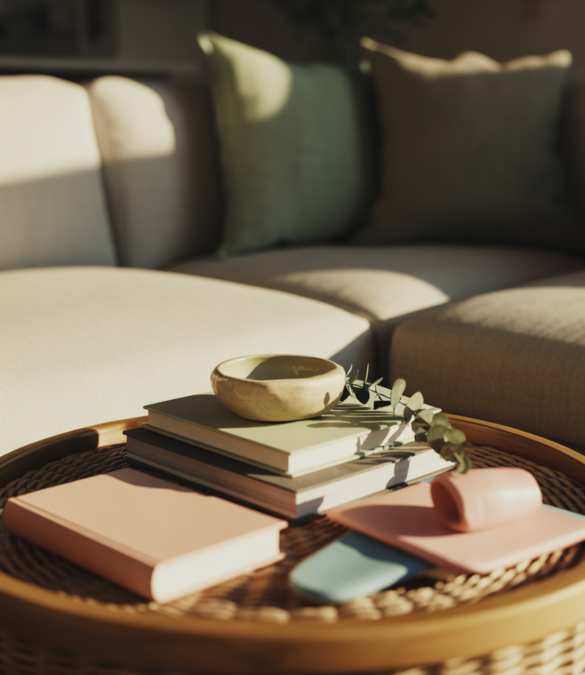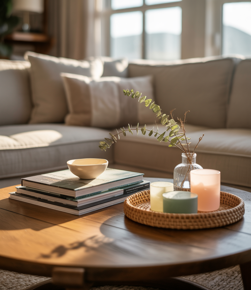 A coffee table can become a striking focal point with just a few intentional accents. Mixing books, small ceramics, and soft greenery brings balance and charm. Adding gentle colorful touches, a subtle hint of cozy texture, or simple DIY elements helps create a playful yet refined display suitable for any living room.