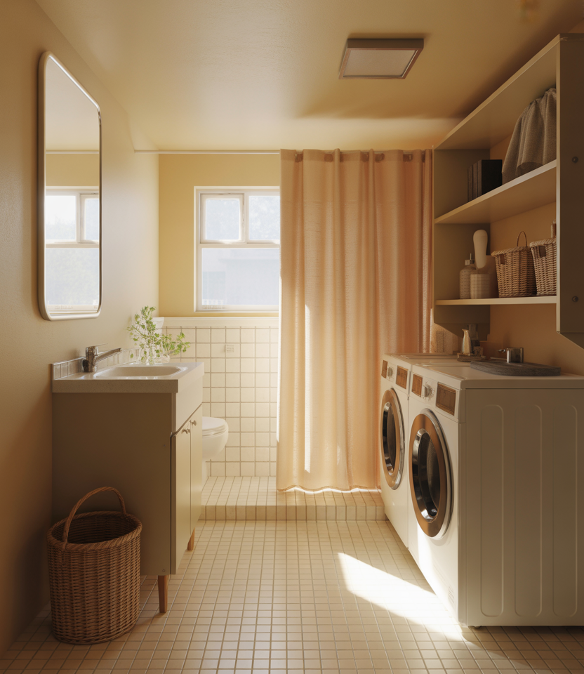 When space is tight, a combined small bathroom/laundry can be the most realistic way to carve out a laundry zone. Think of one wall with a slim sink, under-counter storage, and a floating shelf above the machines. Use simple tile, light paint, and a shower curtain with just a little pattern so the room feels calm, not chaotic, even when baskets start to pile up on busy days.