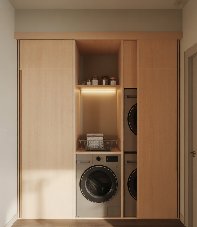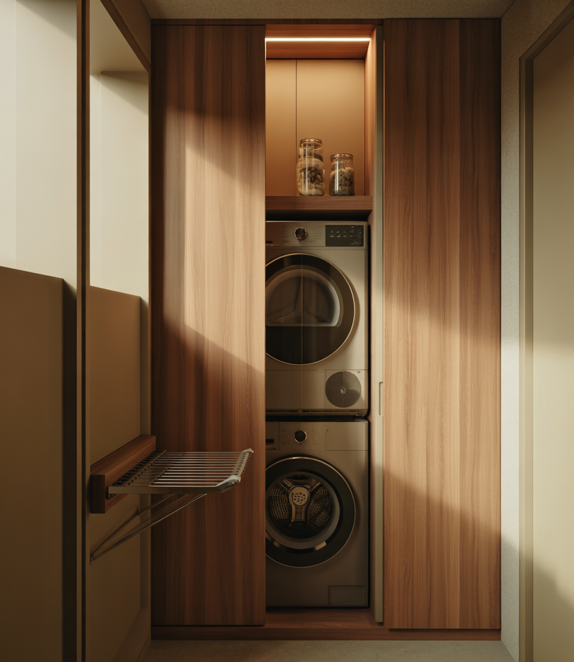 Transforming a hallway nook into a sleek laundry zone is easier than most homeowners expect. Sliding panels conceal a compact setup built around a stackable unit, a slim overhead shelf, and a wall-mounted drying rack. Soft neutrals and integrated lighting ensure the niche feels intentional, not improvised, even in tighter tiny interiors.