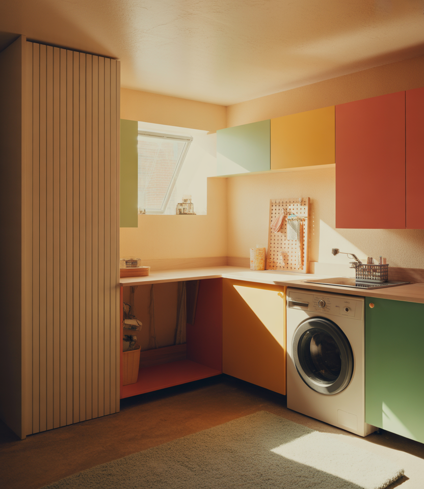 In many American homes, especially split-level and ’70s ranch houses, space gets divided into odd corners. This hidden folding-wall setup aligns perfectly with those layouts, giving you an efficient laundry area that doesn’t intrude on living or storage zones.