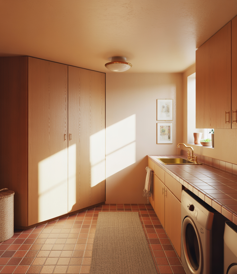 A laundry room anchored by warm terracotta tile can feel both nostalgic and fresh. Pair the flooring with a neutral cabinet run, a classic drop-in sink, and a curated decor moment using framed prints or jars. Brass hardware and a patterned runner lend vintage energy without making the space feel theme-heavy or cluttered.