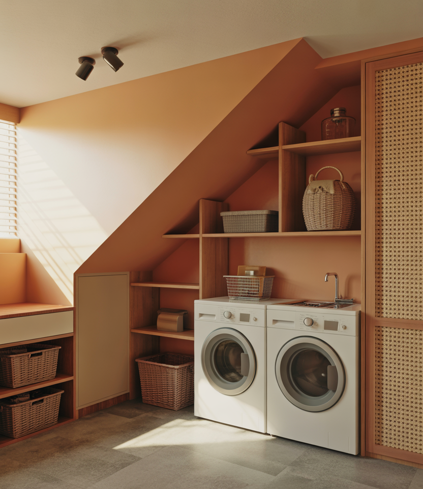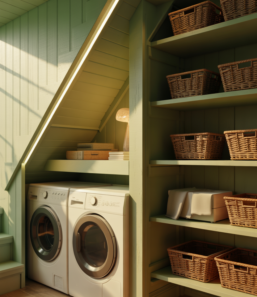 Unused under-stair voids can become efficient laundry stations with clever planning. Install a top loader if height allows, or swap to a low-profile Stackable washer-dryer unit framed by simple shelf supports. A painted feature Wall- and motion-activated lighting help make the small space feel surprisingly polished and practical.