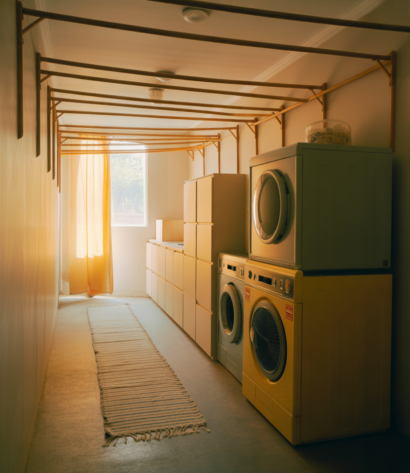 In a slim laundry corridor, vertical solutions shine. Mount minimalist wooden poles along one wall to act as a suspended drying rack, add slim cabinet units above the machines, and use warm colors to soften the tight footprint. This arrangement keeps the walkway clear and cushions the visual clutter typical of narrow spaces.