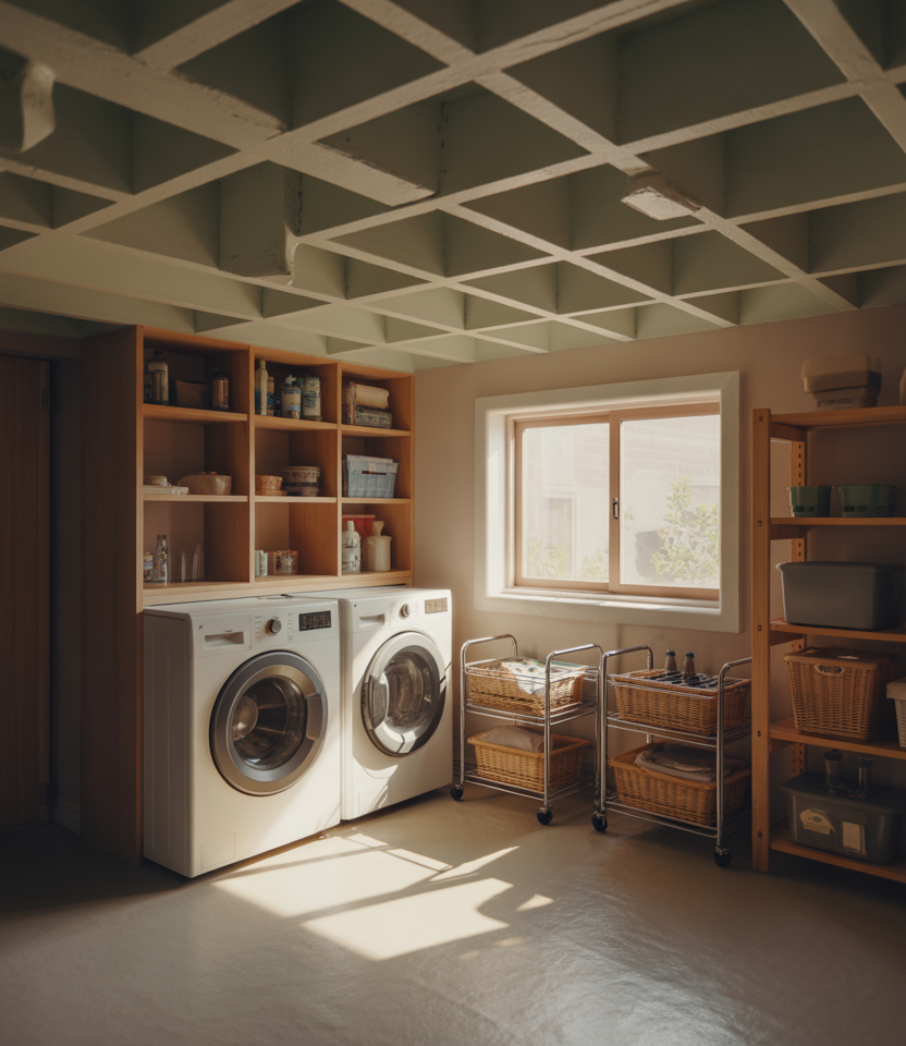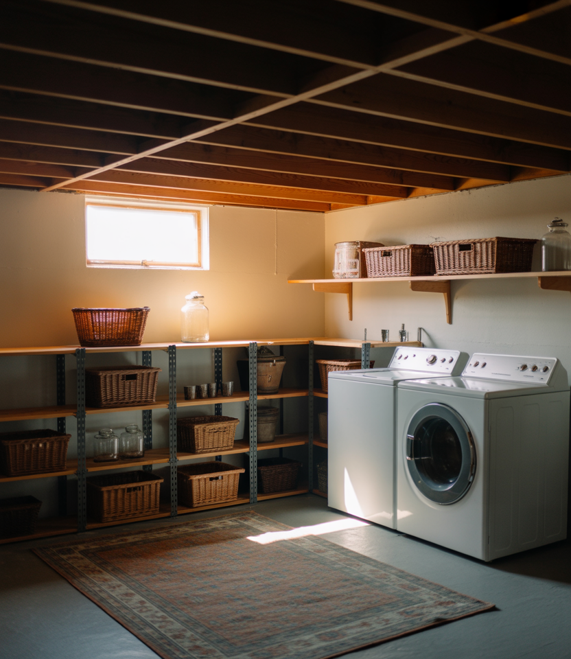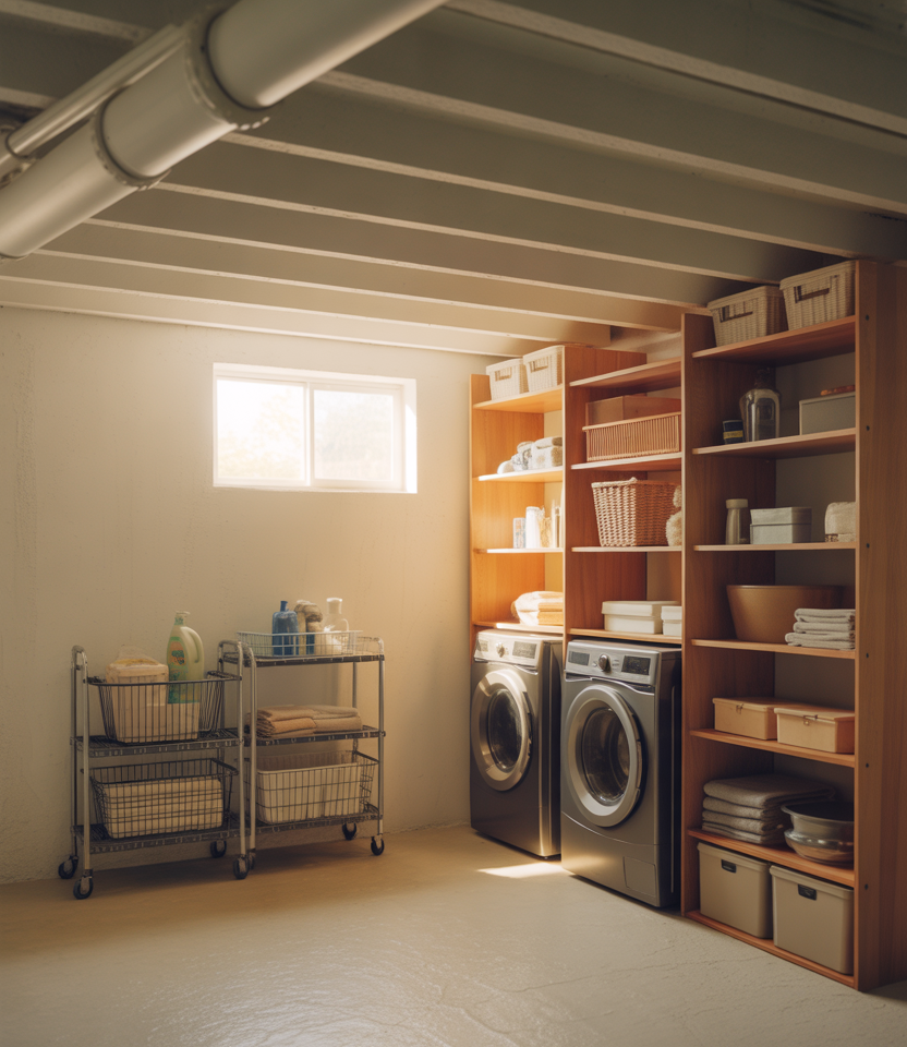 Turning a simple alcove in an unfinished basement into a cheerful laundry zone is more achievable than it looks. Use mobile storage carts, bright decor touches, and a tall shelf system for bulk supplies. Painting exposed ceilings black or white instantly makes the area feel unified, even without a full remodel.
