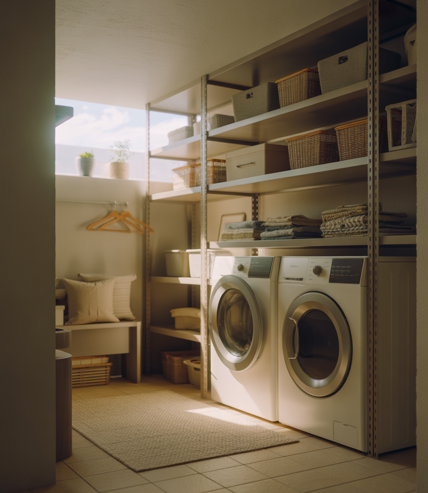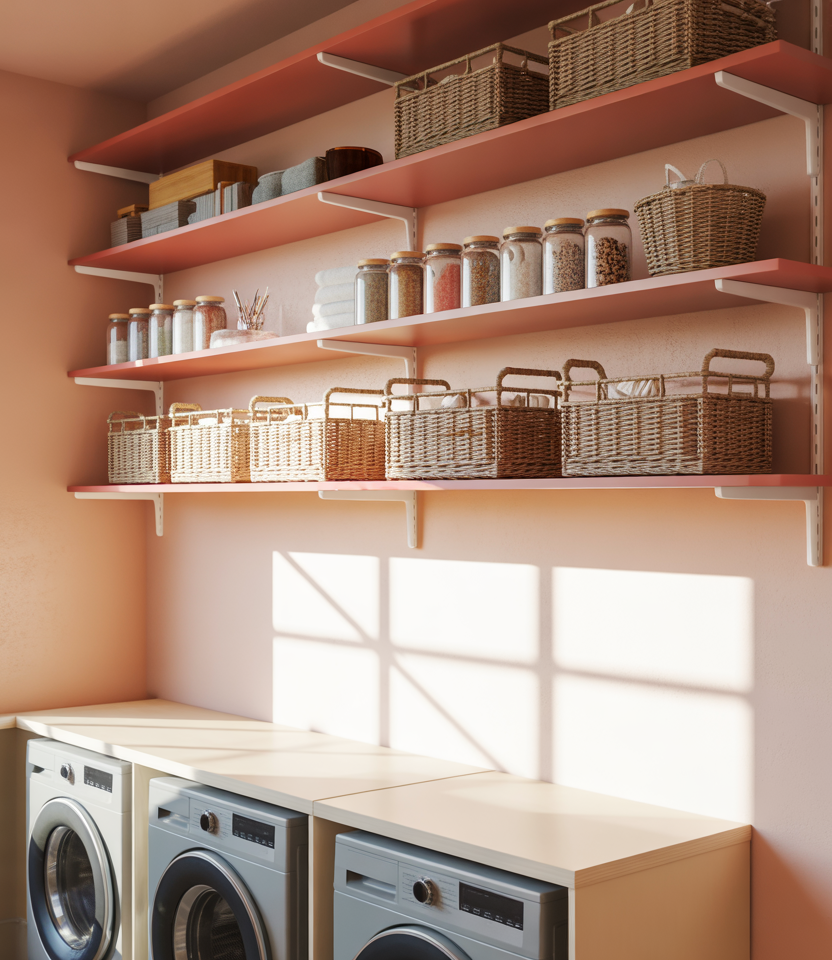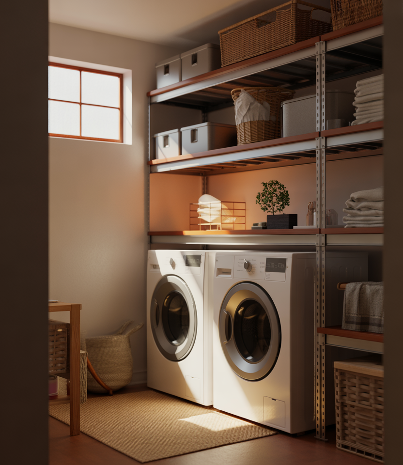 When a full remodel isn’t in the plan, open storage systems offer structure on a budget. Metal shelving, light decor, clear containers, and a simple shelf frame around the machines create order instantly. In a basement or garage, this approach keeps essentials accessible and the space feeling cleaner.