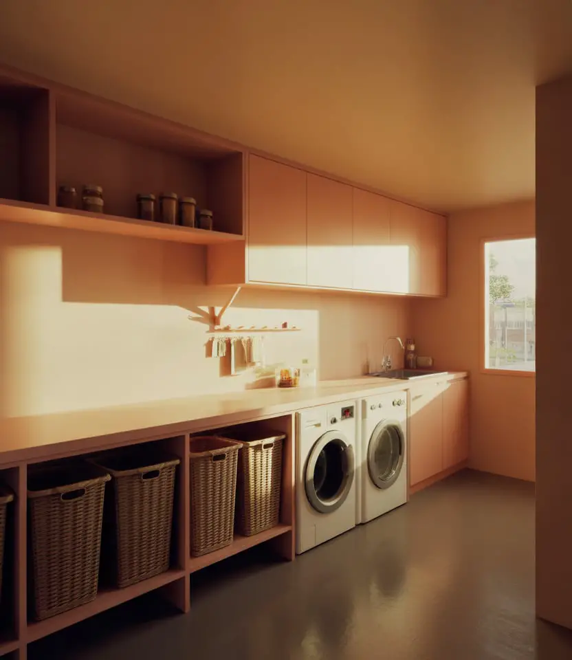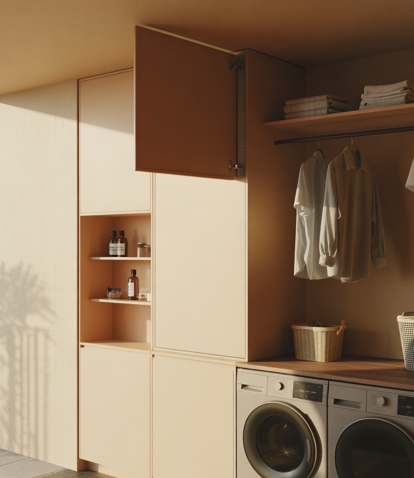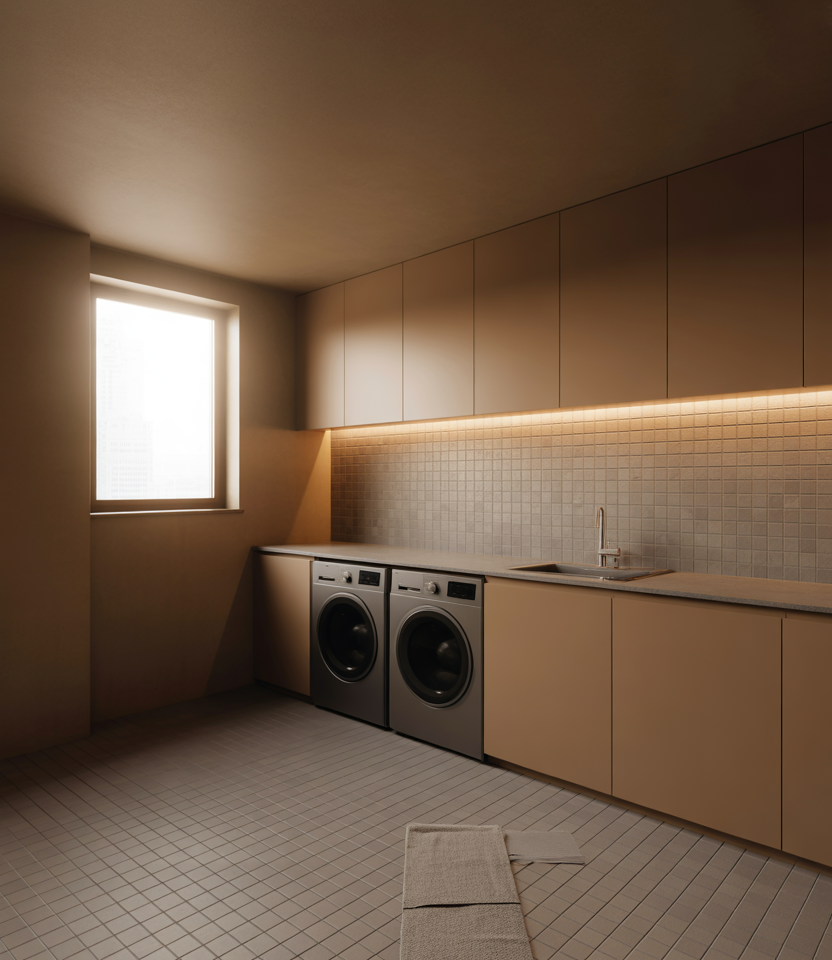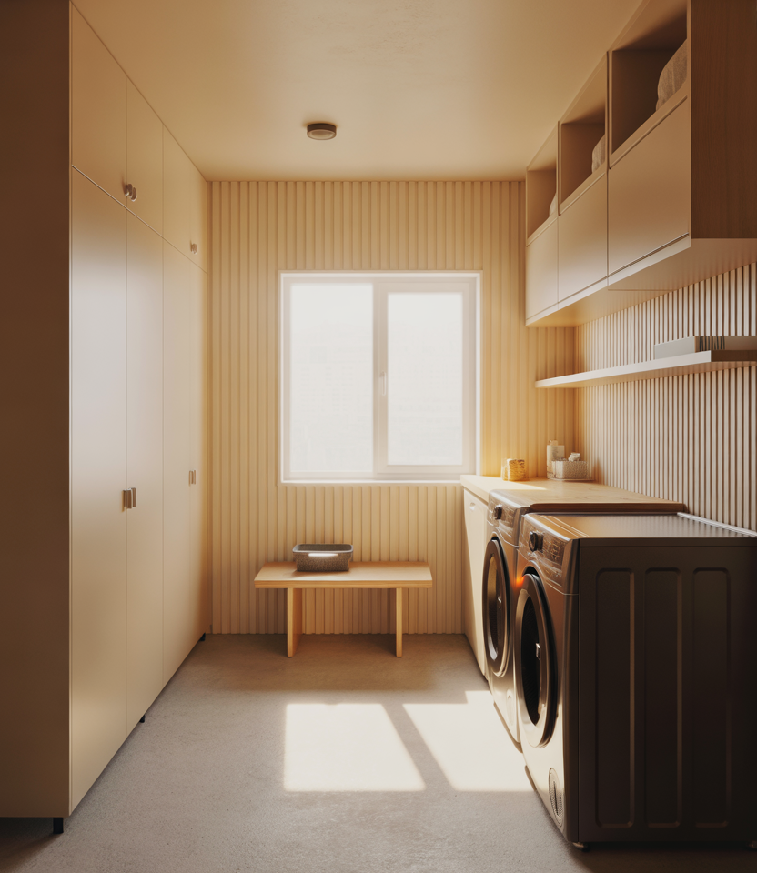 Expert-style commentary: linear lighting reduces harsh shadows and makes sorting laundry easier. Opt for matte finishes so the light doesn’t cause distracting glare. Thin MDF slats or flush panels near the machines are easier to clean and provide the sleek effect minimalism depends on.
