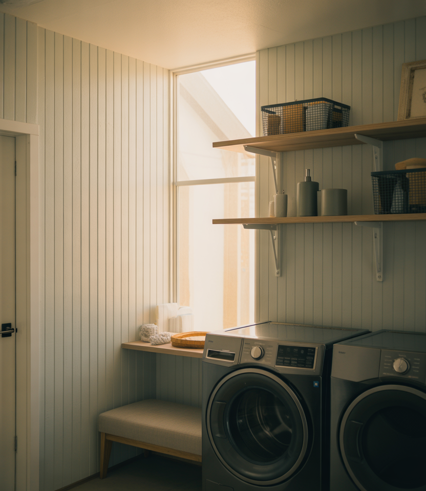A polished laundry room often begins with updated architectural details. Slim vertical panel lines on the wall create rhythm behind a top loader, while floating decor pieces and matte colors soften the machines’ bulk. A narrow bench or hamper nook adds warmth without crowding the workspace.