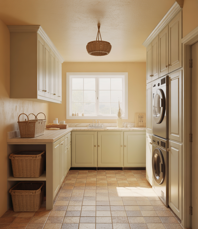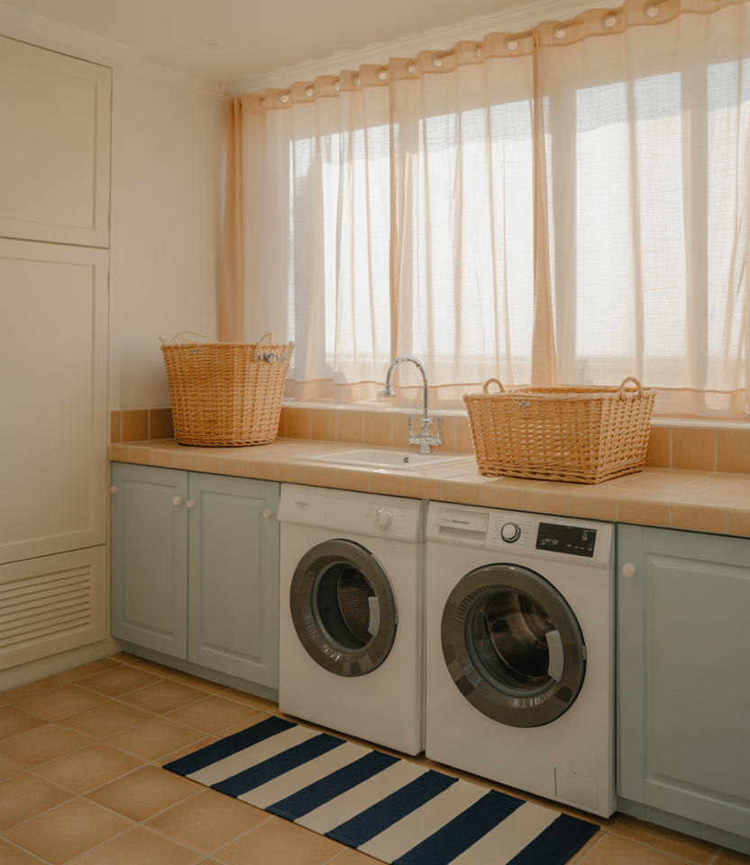 A gentle coastal palette can turn even small laundries into calm transitional spaces. Use sandy colors, pale cabinet fronts, and stone-look tile paired with simple storage baskets. The result feels breezy without leaning into clichés, especially when you balance warm metals and natural woven textures.