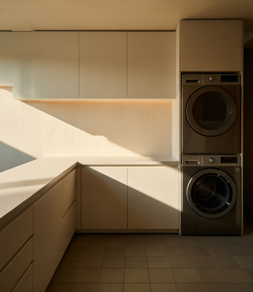 Minimalist laundry rooms feel calm and architectural. Choose clean cabinet fronts without handles, gray tile finishes, and a slim LED line washing the wall with light. A compact, stackable washer-dryer frees valuable floor space and keeps the room feeling spacious, even in compact city apartments.