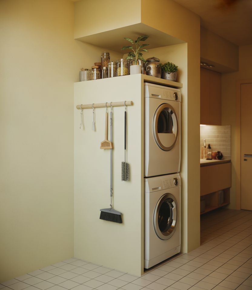 Tall machines with a stackable dryer on top are one of the best choices for tiny homes or apartments. To achieve a more intentional and integrated look, build a shallow cabinet to the front, and add hooks or a small rail to the side. Soft design details can be added to the narrow ledge above and to the adjacent niche, which is a great spot for extra stackable bins for cleaning supplies.