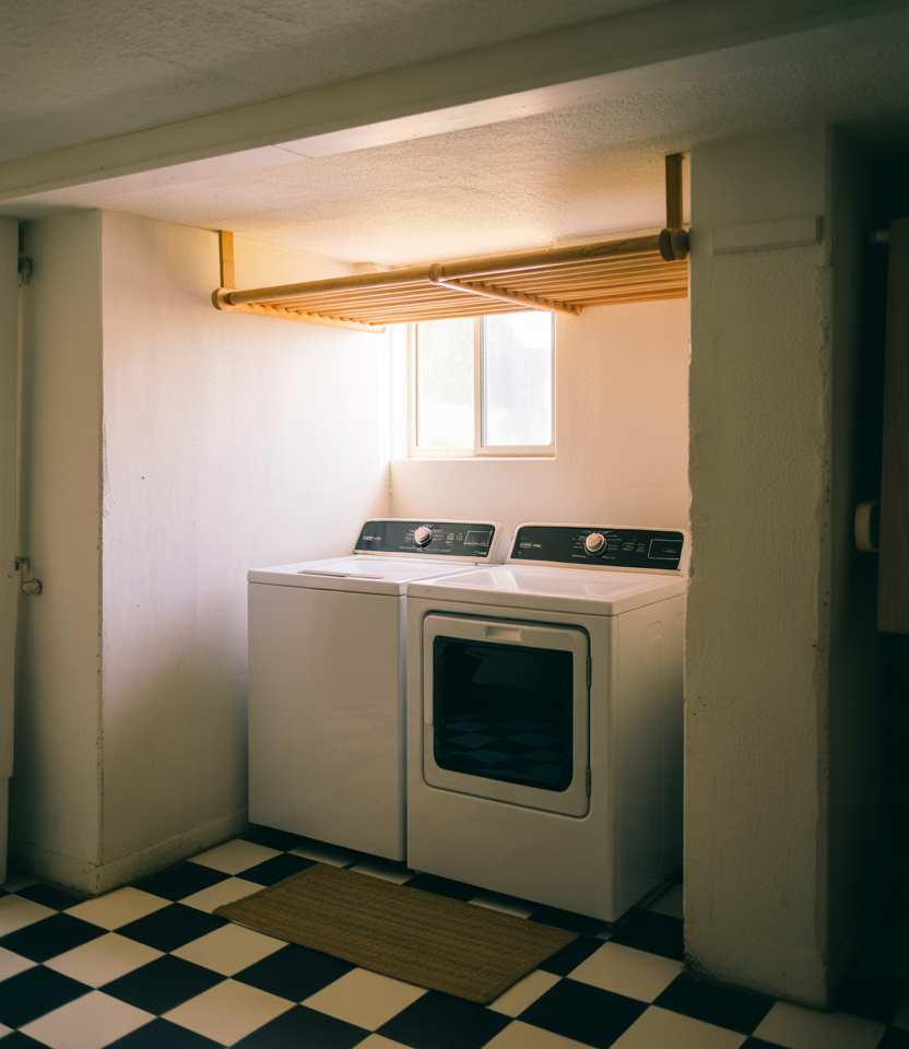 Plenty of older American homes still rely on a basic basement laundry, and that’s fine—especially if you build in a serious drying rack zone. Pair a sturdy top-load washer with a newer dryer, then frame the area with checkerboard tile underfoot and bright paint on the walls. A hanging rack above the machines turns open air into real estate for delicates and workout gear.