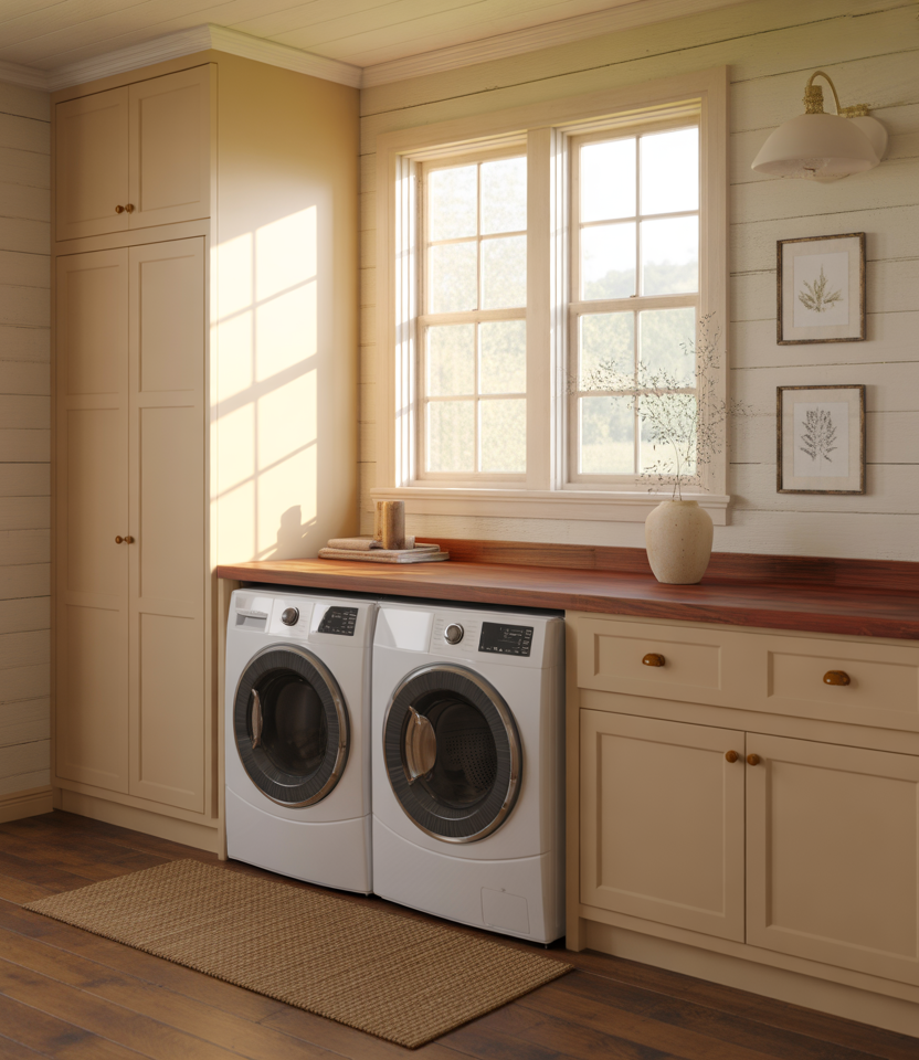 If your style leans cozy, a farmhouse-inspired laundry can feel like a tiny retreat. Think creamy shaker cabinet fronts, brushed brass hardware, and chalky white wall paint layered with gentle colors in art and textiles. Add a simple rug and maybe a vintage stool so folding doesn’t feel like punishment. It’s less about shiplap overload and more about materials that feel tactile and lived-in.