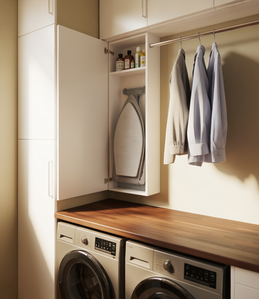 For people who still press shirts and napkins, dedicating space to an ironing board can be a luxury. A fold-out wall cabinet hides the board when you’re done, freeing floor space while adding subtle wall interest. Pair it with slim vertical storage for spray starch, distilled water, and hangers so everything you need for ironing lives in one neat, reachable column beside the machines.