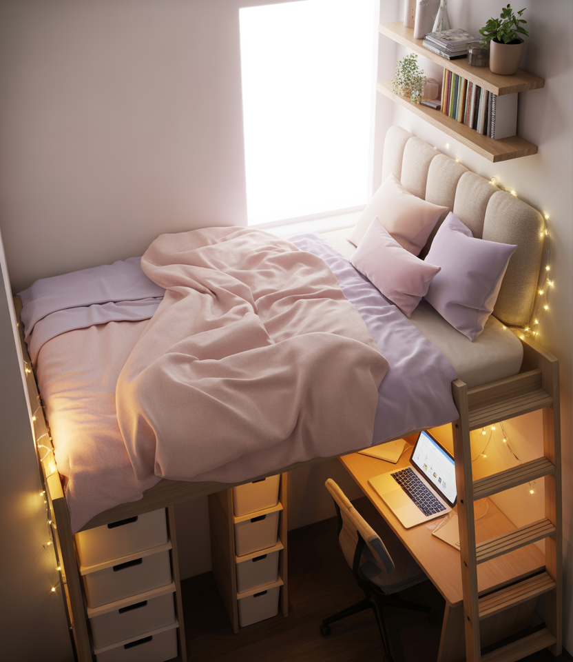 A practical way to approach this layout is to map vertical zones before move-in: sleep, study, storage, and relaxing. Planning where each category lives makes unpacking faster and prevents that mid-semester chaos where books, snacks, and clothes begin to blend into one overloaded corner.