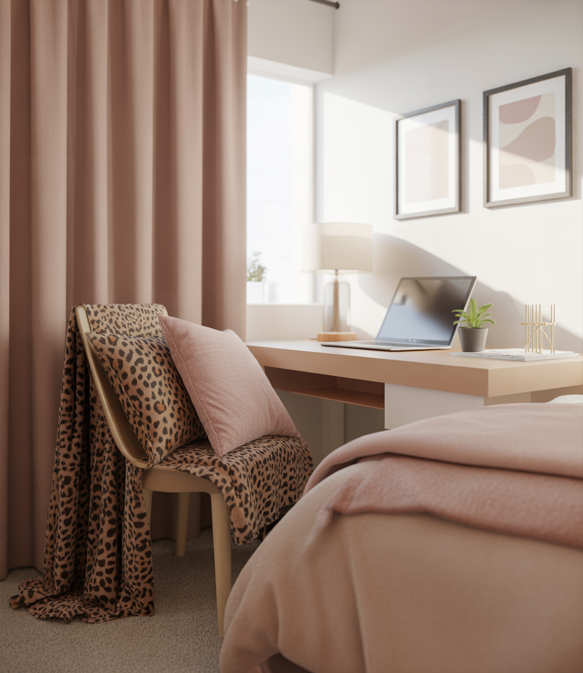 For those who prefer bold personality, mixing clean neutrals with subtle cheetah elements and pops of pink or colorful décor adds playfulness without overwhelming the layout. It’s a confident look that’s surprisingly easy to incorporate with pillows, throws, or peel-and-stick patterns.