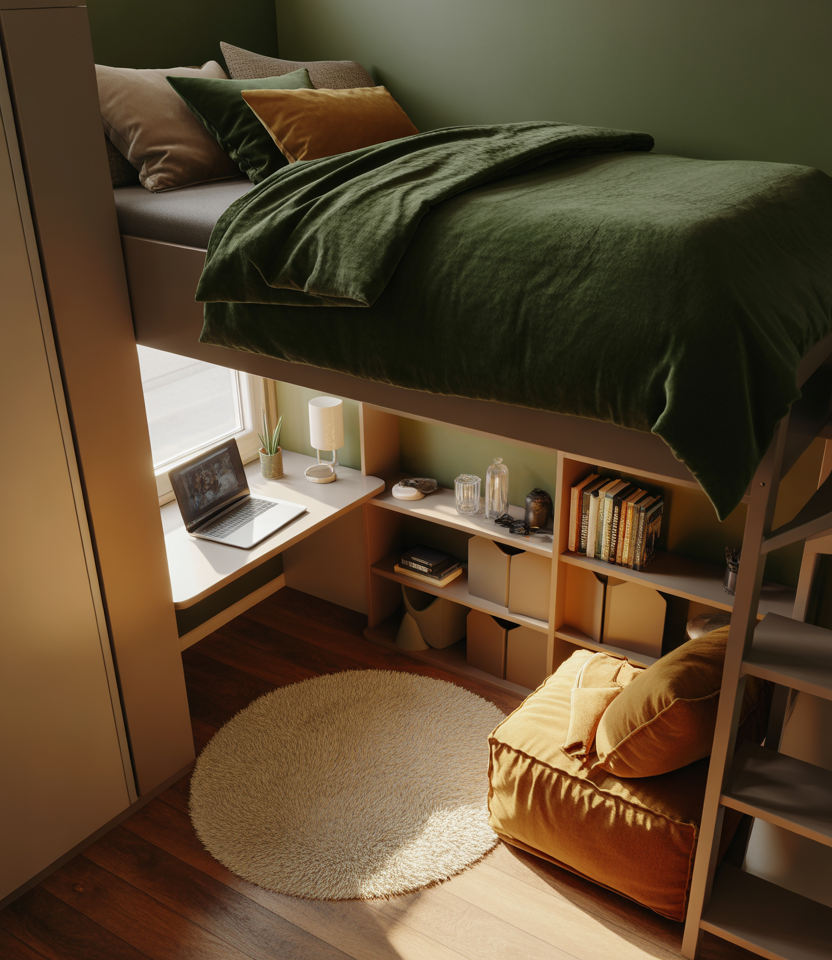 For dorms that feel more like tiny studios, layering calming tones of green with a sleek lofted bed and soft aesthetic details keeps everything feeling intentional, not cramped. Use the height of the room to carve out zones: sleep above and study and lounge below, with storage woven neatly into every spare inch.