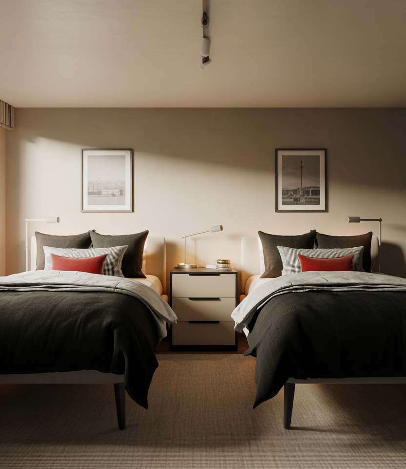 This layout works especially well in long, narrow rooms where each bed hugs a wall and the center acts as shared territory. Keeping the middle area clear for a rug or storage ottoman gives everyone equal access and reinforces that the room belongs to both of you, not just whoever moved in first.