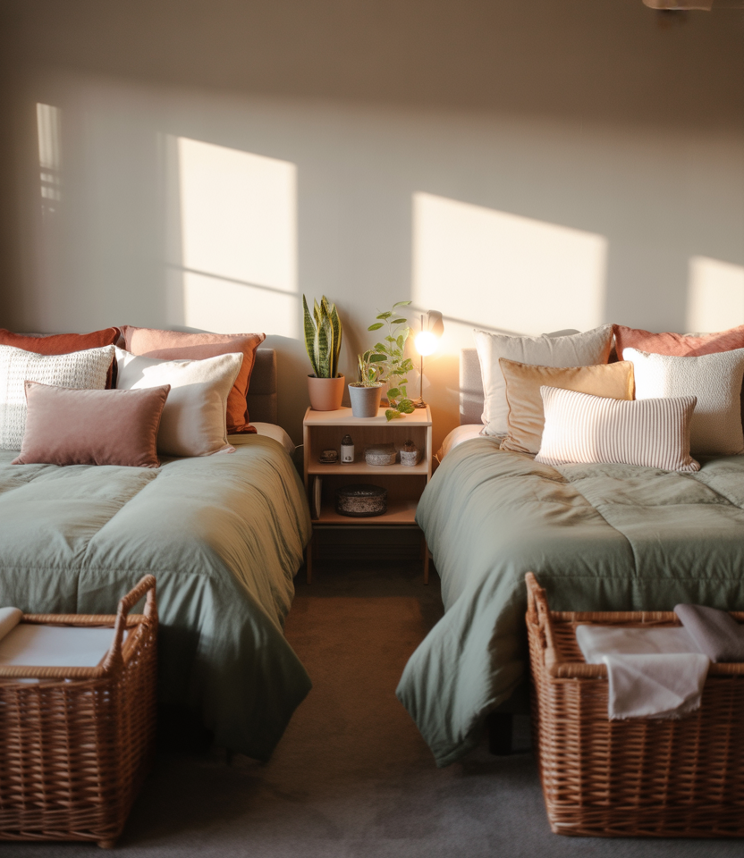 This idea is for roommates who want their space to feel like a calm retreat, not just a crash pad. Soft sage green bedding, a few cute pillows, and subtle cues that the room is truly shared—like matching baskets or hooks—help the space feel harmonious without being overly coordinated or childish.