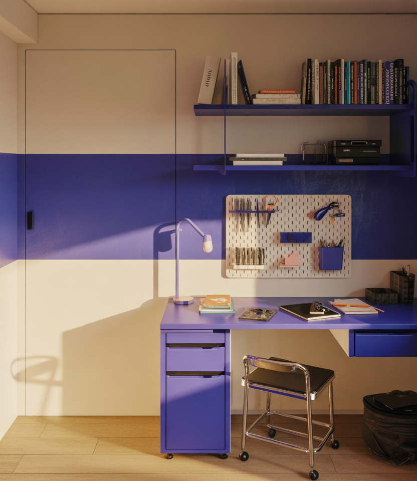For students who thrive on color, a focused stripe of purple and blue across the study wall adds energy without taking over the entire space. Pair that with streamlined organization—floating shelves, a pegboard, a tidy rolling cart—and the desk zone becomes the visual anchor instead of the clutter magnet.