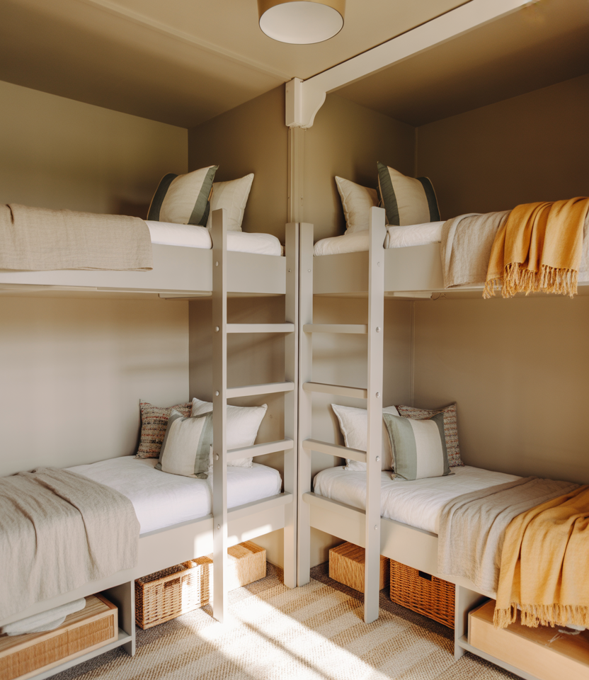 If you love relaxed coastal style, a palette of sandy neutral shades with subtle beach references and soft touches of yellow can make even a compact bunk setup feel calm. Think pale wood textures, woven baskets, and a few shell-inspired shapes rather than full-on beach-theme décor.