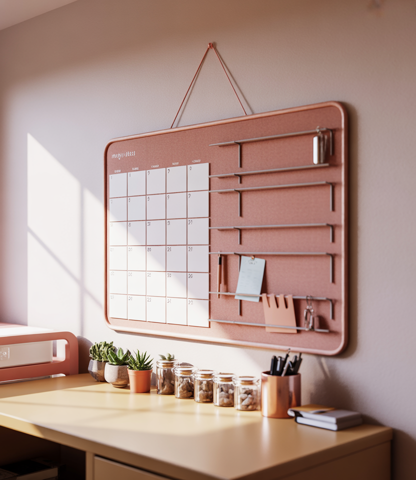A focused command wall can keep the whole room on track. Imagine a soft pink pinboard, a slim calendar, and smart organization rails over a compact desk, all floating against a calm neutral backdrop. It turns a simple wall into the brain of the dorm, where schedules, keys, and reminders actually stay visible.