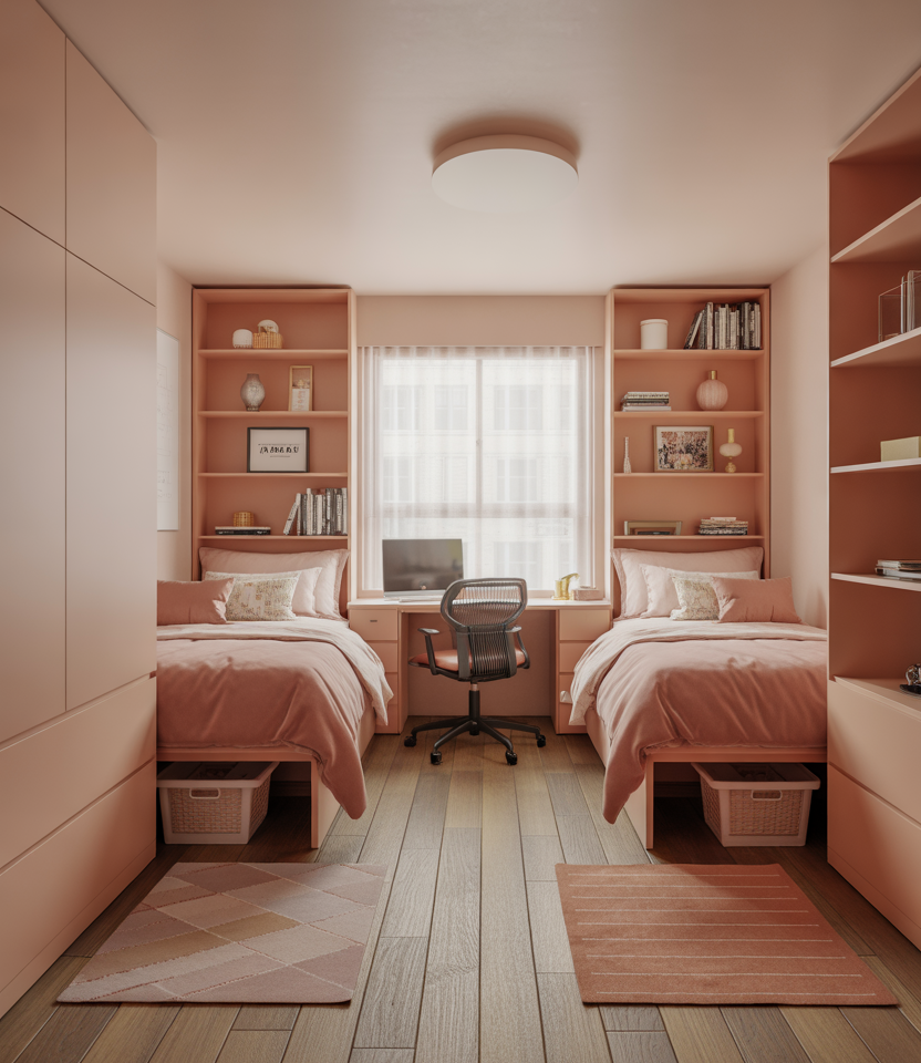 In tight dorms, visual separation can make a huge difference. A soft palette of pink and neutral textiles, paired with simple organization tricks, helps mark out a semi-shared boundary between sleep and study zones. Think slim bookshelves, curtains, or rugs doing the work of a wall while still keeping the layout flexible for move-in changes.