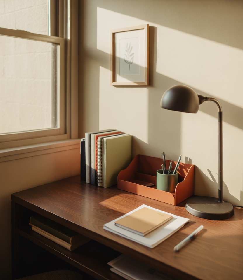 On many American campuses—especially in older East Coast or Midwest dorms—the built-in desks are basic but sturdy. Layering in this warm-and-black palette helps those pieces feel less institutional and more like a small home office, making late-night paper writing just a bit more bearable.