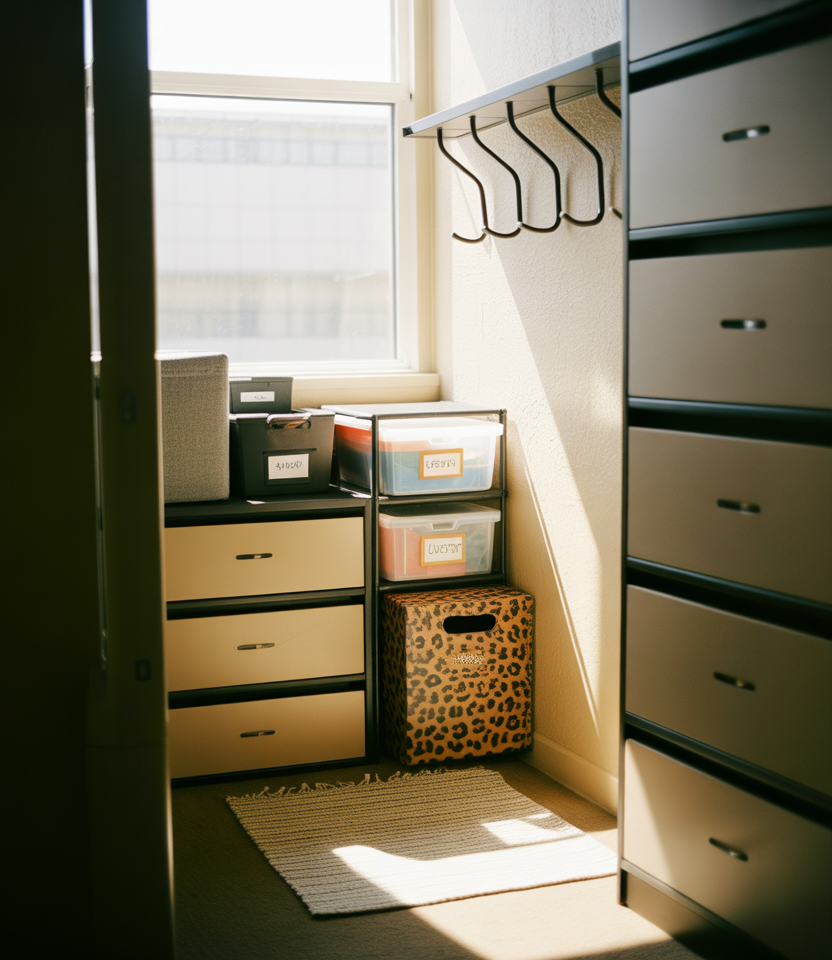 Storage towers don’t have to be boring. Stackable bins or drawers in soft tones with a flash of cheetah pattern, a few colorful labels, and small hits of yellow can turn an organization corner into a design moment. It’s an easy way to add personality near the door or under a lofted bed.