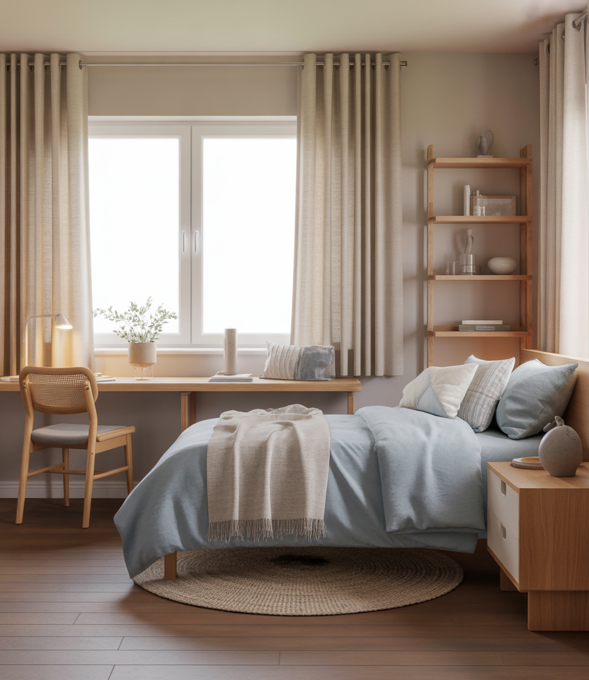 One practical insight: if you use furniture as a divider, keep it open or low so light can still travel across the room. Closed wardrobes can make dorms feel cramped, but open shelving or fabric panels preserve privacy while letting airflow and daylight reach both sides of the space.