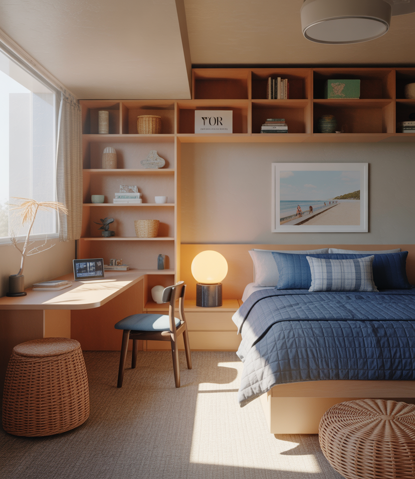 An expert-style approach uses texture variation to elevate the look—faux leather for depth, woven patterns for softness, and wood tones for warmth. This mix creates a surprisingly mature and inviting dorm environment.